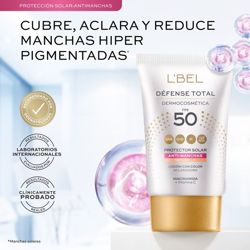 Protector Solar Facial Antimanchas Défense Total con niacinamida y vitamina C que cubre, aclara y previene manchas. 30 ml e 1 fl. oz. (10.10 x 4.40 x 2.10 cm) NSOC40623-25CO.
